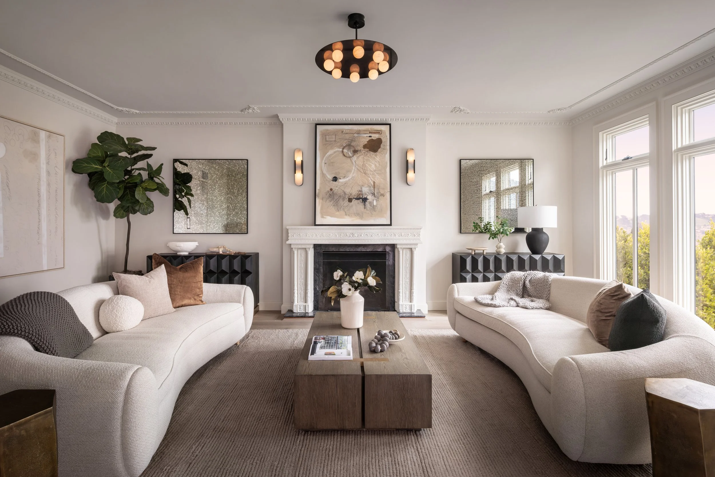 Kelly Wearstler alabaster sconces and living room ceiling light (Visual Comfort)