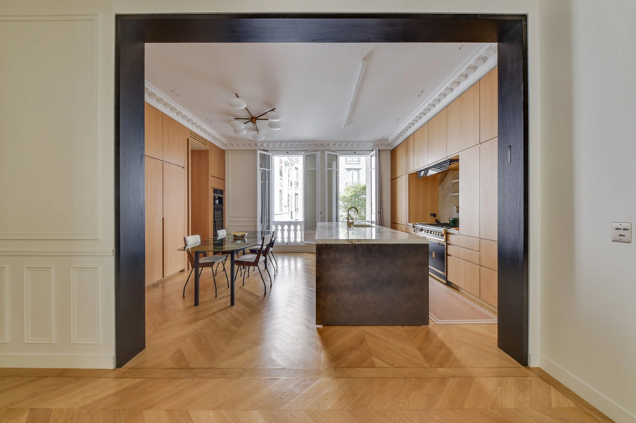 With a ceiling height of 3.30 meters, the apartment boasts classic Haussmannian elements like a fireplace, moldings, and parquet floors. It is bright and airy with double exposure and balconies, and it offers modern comforts such as underfloor heating and air conditioning.